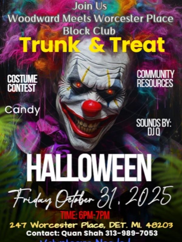 Woodward meets Worchester Place Block Club is promising a wicked good time! With a DJ, costume contest and some community resources too. Contact Ms. Quan Shah @ 313-989-7053 for more info.