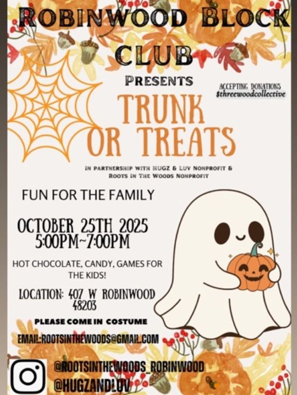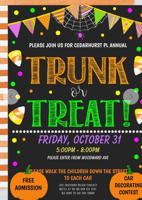 With their annual Trunk-or-Treat. Yes the longest running trunk or treat in the neighborhood, starts on Cedarhurst Pl. and this year depending on how many cars join the fun may spill over to Parkhurst. There is still time for you to donate goodies, or get a parking spot on the block. Text Ms. Ketta today at 313-218-8391. Children come from all over the city for this spooktacular event, so let's give them pumpkin to talk about! Bring that Hocus Pocus to your Trunk/Costume decorations and you may take home the honor of the Best Car Award!